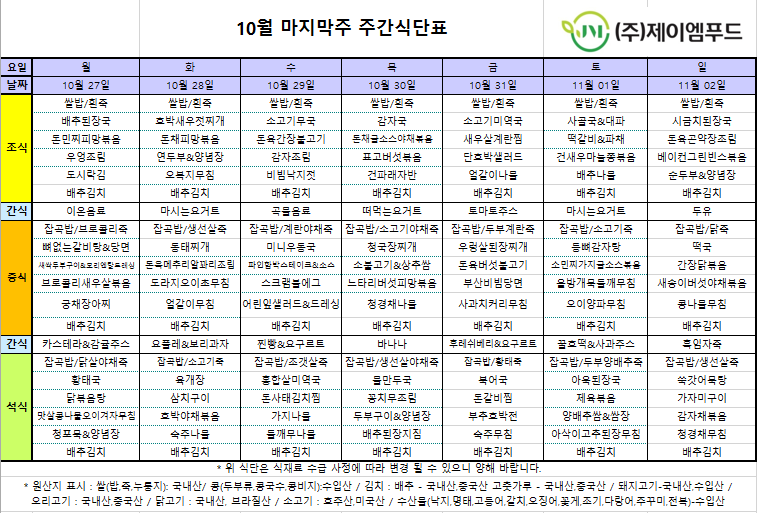 신월실버요양원 주간식단표 (25.10.27~25.11.02)
